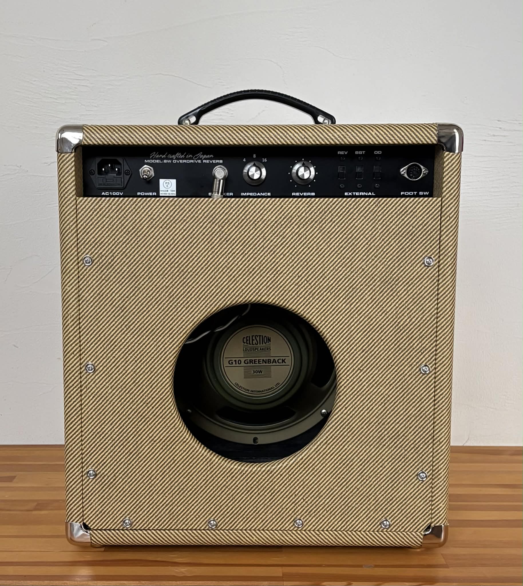 OverDrive、スプリングリバーブ付きです。フットスイッチは3連スイッチで、OverDrive,Boost、ReverbのON/Offを切り替え可能です。